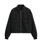 Classic Collared Style Denim Jacket With Floral Embroidery Long Sleeve Zip up Cropped Casual Coat